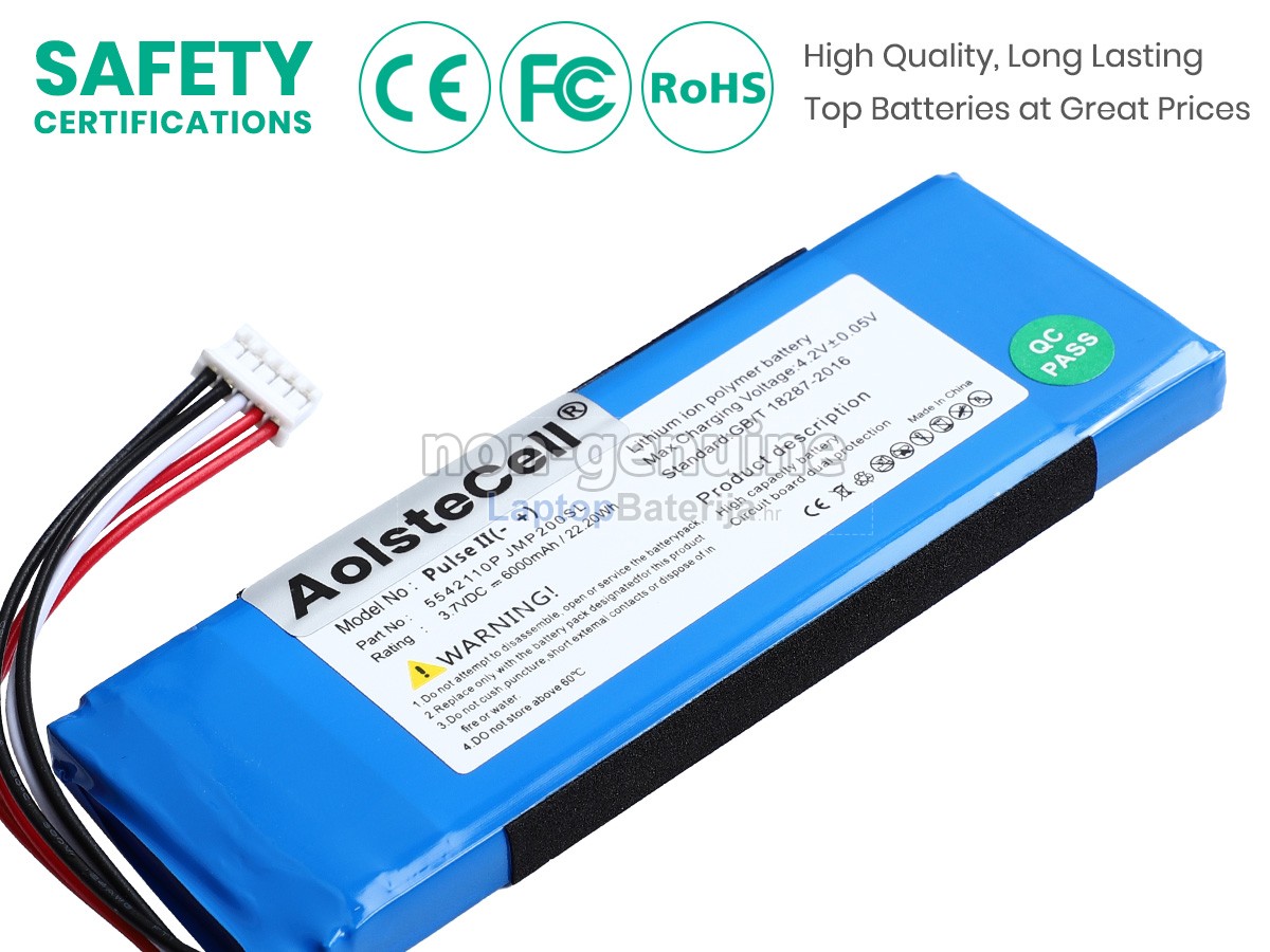 laptopbaterija.hr razumije da je sigurnost baterije veoma važna. Čvrsto smo predani tomu da ne koristimo niže kvalitetne sirovine! Svaka zamjenska baterija JBL PULSE 2 strogo se ispituje stotine puta prije napuštanja tvornice kako bi se osigurali standardi visoke kvalitete. Mi strogo kontroliramo kvalitetu baterije, svaka baterija za zvučnike JBL PULSE 2 prošla je CE, UL, ROHS, ISO9001 i druge certifikate o državnoj sigurnosti. Ne samo da je 100% kompatibilna već ima i pametnu zaštitu od sigurnosnih problema kao što su pretjerano punjenje, pretjerano pražnjenje i pregrijavanje. Pored toga, naš tehnički tim će, također, ispitati napon i kapacitet baterije prije isporuke kako bi osigurao da baterija koju primite radi ispravno.